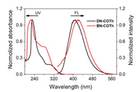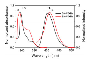 | Fig. 3. The normalized UV—vis and fluorescence spectra of DN-COTh and BN-COTh in THF ([C] = 1.0 × 10-5 mol/L, λex = 300 nm). | |