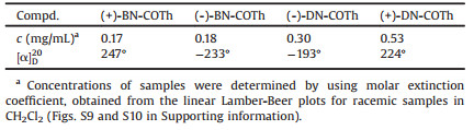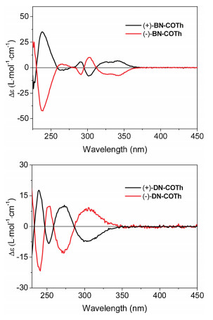 The chiral resolutions of rac-DN-COTh and rac-BN-COTh were done by chiral HPLC with hexane as eluent for rac-DN-COTh and hexane/isopropanol (99.7:0.3, v/v) as eluent for rac-BN-COTh, respectively. The enantiomers of both DN-COTh and BN-COTh were obtained successfully with high ee value (≥ 97%) as shown in Fig. S11 (Supporting information).