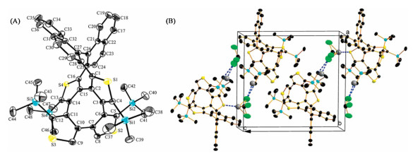| Fig. 5. Single crystal (A) and crystal packing structure (B) of (R, R, R)-BN-COTh. Carbon, silicon, sulfur, and chlorine atoms are depicted with thermal ellipsoids set at 30% probability level. Part of hydrogen atoms are omitted for clarity. | |