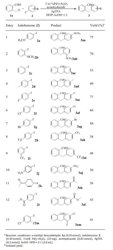In summary, it was found for the first time that heterogeneous palladium catalyzed C(sp3)-H bonds functionalization reaction by a transient directing strategy. Using 3 wt% Pd/γ-Al2O3 as heterogeneous catalyst and acetohydrazide as TDG, a broad scope of o-methylbenzaldehydes react with various para-, meta-, and ortho-substituted aryl iodides to synthesize the corresponding mono-arylation product in yields up to 84%. Also, the reaction can tolerate various functional groups, including alkoxy, alkyl, halogen (F, Br and Cl), acyl, ester, trifluoromethyl, and nitro group. The catalyst can be readily recovered and reused for four cycles without significantly losing activity. The practicality of this study opens new avenues for heterogeneous Pd-catalyzed C—H functionalization chemistry.