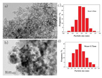 | Fig. 3. TEM images of 3 wt% Pd/γ-Al2O3: (a) fresh catalyst; (b) used (after 1st recycle) catalyst; (c, d) The size distributions of fresh and used catalysts were obtained from TEM images by counting > 200 isolated palladium particles in the images of a sample. | |