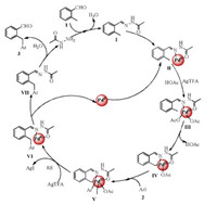 Based on the commonly accepted mechanism from the literature, the proposed reaction pathway is shown in Scheme 2. Initially, aldehyde reacts with acetohydrazide to form acetohydrazone Ⅰ, which serves as a directing group in the next step. Then, bidentate coordination of the acetohydrazone moiety in Ⅰ to the supported palladium nanoparticles occurs to form the chelated cyclometalated Pd-complex Ⅱ. Then AgTFA/AcOH-promoted oxidation of Pd0 into the intermediate Ⅲ [7], and subsequently, PdⅡ activates the ortho C(sp3)-H bond to generate cyclopalladated intermediate Ⅳ and HOAc. Then, oxidative addition of intermediate Ⅳ and aryl iodide takes place to form intermediate Ⅴ [14]. The iodide of intermediate Ⅴ was captured by AgTFA to generate AgI precipitate and then it undergoes reductive elimination to obtain intermediate Ⅵ. Subsequently, intermediate Ⅵ is decomposed to intermediate Ⅶ along with the Pd0 species to complete the catalytic cycle [7]. Intermediate Ⅶ is hydrolyzed to the desired product 3 and acetohydrazide.