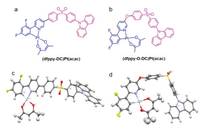 To solve this issue, herein, we proposed that the molecule should not only possess planar structure but also have appropriate steric hindrance, in which the planar moiety can possess good intermolecular π-π interaction and the steric hindrance affects the molecular packing, probably in favor of the external stimuli, such as pressure and grinding (Fig. 1). On the other hand, the steric structure has a positive effect on suppressing the emission quenching in solid state and increasing the solubility, implying a promising application in solution processable OLEDs. With these in mind, we employed the typical platinum complex of (dfppy)Pt(acac)[(2-(4', 6'-difluorophenyl)pyridinato-N, C2'2′)(2,4-pentanedionato-O, O)Pt(Ⅱ)] as the emission core, which has a square-planar structure. Then a second emissive fragment of 9-(4-(phenylsulfonyl)phenyl)-9H-carbazole (DC) bearing bent shape was introduced into the cyclometalating ligand (Fig. 2). In order to further explore the molecular structure-property relationship, an oxygen atom was integrated between the platinum complex-based emission core and the DC moiety, probably playing a crucial role on the molecular packing. To prove our hypothesis, two platinum complexes of (dfppy-DC)Pt(acac) and (dfppy-O-DC)Pt(acac)bearing bent shape were prepared and characterized, and their structure-property relationship was explored systematically.