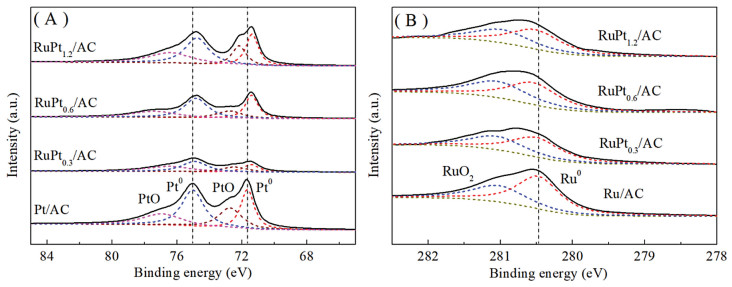 | Fig. 2. XPS spectra of Pt 4f (A) and Ru 3d (B) for RuPtx/AC catalysts | |