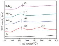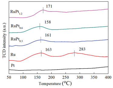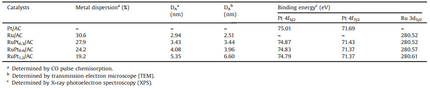 CO pulse chemisorption was used to characterize the Ru dispersion and particle sizes for all the catalysts. As listed in Table 1, with the increase of Pt content, the metal dispersion gives a slight decrease. During the two-step incipient impregnation process for the catalyst preparation, Ru particles could deposit around Pt particles, and finally formed RuPt nanoparticles after reduction. Therefore, the increase of Pt content resulted in larger RuPt nanoparticles.