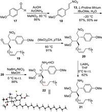 Then we focused on the synthesis of the amino acetal fragment. To supply a large amount of substrate for a thorough exploration of the formal [5 + 2] annulation reaction, a simplified amino acetal 21 was used (Scheme 3). To begin, β-nitrostyrene 18 was prepared from p-anisaldehyde 17 and nitromethane through Henry condensation [14]. After a brief survey of reaction conditions, we were delighted to find that when β-nitrostyrene 18 and aldehyde 13 were treated with l-proline lithium salt in tBuOMe at −20 ℃, the nitroaldehyde 19 was obtained in 87% yield and 93% ee [13c]. Then 19 was converted to the corresponding acetal 20 by treatment with pTSA and trimethylorthoformate. Finally, the nitro group in 20 was smoothly reduced to an amino group by LiAlH4 to deliver the desired amino acetal 21 in 62% yield. Interestingly, when 20 was treated with NaBH4 in the presence of NiCl2, the double bond in the aliphatic chain was saturated while the nitro group was also reduced to generate an HCl salt (22) of the corresponding amino acetal [15]. Fortunately, we got a single crystal structure of 22 (CCDC No. 2001009), which confirmed the absolute configuration of the C15 and C23 stereocenters.