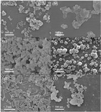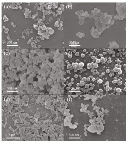 | Fig. 1. SEM images of (a) ZIF-CoZn3-PhA, (b) ZIF-CoZn3-OA, (c) ZIF-CoZn3-nBuA, (d) ZIF-CoZn3-BnA, (e) ZIF-CoZn3, (f) ZIF-CoZn3-M. | |