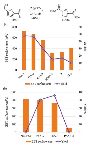 As shown in Fig. 3, both amine type and molar ratio of Zn/Co have significant influences on the BET surface areas of Co@NCs, which affect the yield of FDMC. With smaller particle size of Co@NCs, the corresponding higher BET surface area can enhance the yield of FDMC owing to the improvement of the interaction between catalyst and reactant (Fig. 3a). Increasing the amount of zinc results in larger BET surface area due to the evaporation of Zn (Fig. 3b), but it also reduces the amount of Co inCo@NCs (Table S3 in Supporting information). Among all specimens, Co@NC-PhA-3 provides the best result.