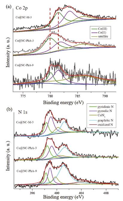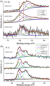 | Fig. 6. XPS spectra of (a) Co 2p3/2 and (b) N 1s of Co@NC-M-3, Co@NC-PhA-3, Co@NC-PhA-9. | |