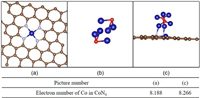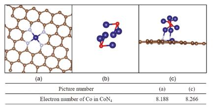 | Fig. 8. Three calculation models of (a) CoN4, (b) Co6O2 and (c) CoN4-Co6O2 and electron number of Co in CoN4. Brown is C; red is O; blue is Co; silver is N. | |