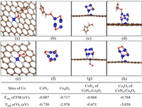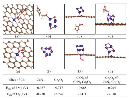 | Fig. 9. The adsorption energies of 2-hydroxymethylfurane (FM) and O2 on different Co sites. FM on (a) CoN4, (b) Co6O2, (c) CoN4 of CoN4-Co6O2, (d) Co6O2 of CoN4-Co6O2; O2 on (e) CoN4, (f) Co6O2, (g) CoN4 of CoN4-Co6O2, (h) Co6O2 of CoN4-Co6O2. Brown is C; red is O; blue is Co; silver is N. | |