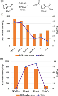 | Fig. 3. The relationship between yields (purple points) of FDMC (or BET surfaces areas of Co@NCs (brown square)) with different preparation process parameters of Co@NCs: (a) amine type; (b) molar ratio of Zn/Co. Conditions: HMF 0.3 mmol, Co@NCs (a) 10 mg or (b) 20 mg, MeOH 3 mL, O2 1 atm, 25 ℃, (a) 24 h or (b) 48 h; GC yields with anisole as an internal standard. | |