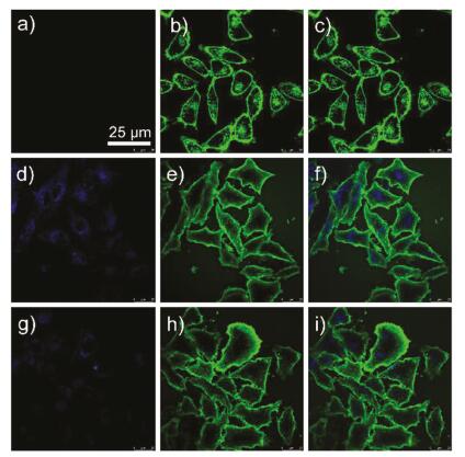 | Fig. 4. Live-cell confocal microscopy images of MCF-7 cells. Cells were incubated with (a) BPV22+, (d) BPV22+@CB[7] and (g) BPV22+@2CB[7] (62.5 μmol/L in PBS solution). (b, e, h) Cells were incubated with WGA. Cells were incubated with WGA and (c) BPV22+ (f) BPV22+@CB[7] and (i) BPV22+@2CB[7]. Scale bars: 25 μm. | |