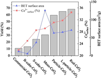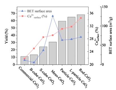 | Fig. 2. Correlation between the Ce3+ proportion/BET surface area and catalytic performance of CeO2 catalysts with various morphologies. | |