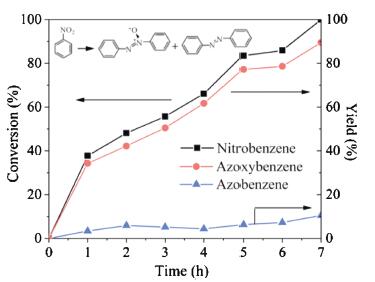 Azoxybenzene is a high-value compound with wide applications in chemical industries as dyes, pigments and agrochemicals [1, 2]. Azoxybenzene is commonly obtained by oxidation of aniline or reduction of nitrobenzene as an intermediate [3, 4]. The conventional production of azoxybenzene entails condensation of stoichiometric nitrosobenzene and hydroxylamine [5]. This process lacks of atom-economy and produces by-products which cause pollution troubles. To simply the reaction steps and prevent the production of hazardous by-products, the development of controlling the selectivity in the midst of nitrobenzene reduction to produce azoxybenzene is of ongoing research interest.