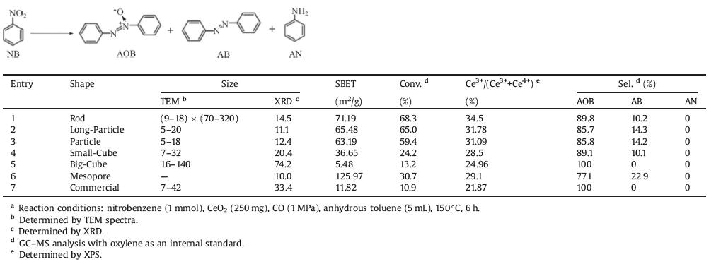 Considering that the morphology engineering of CeO2 is of great importance to control their surface chemistry [16-18], herein, we synthesized a series of CeO2 samples with seven morphologies and applied them in reducing nitrobenzene to azoxybenzene. The relationship of physico-chemical properties of the seven CeO2 catalysts and their catalytic performance was explored to improve azoxybenzene yield under the base-free condition.