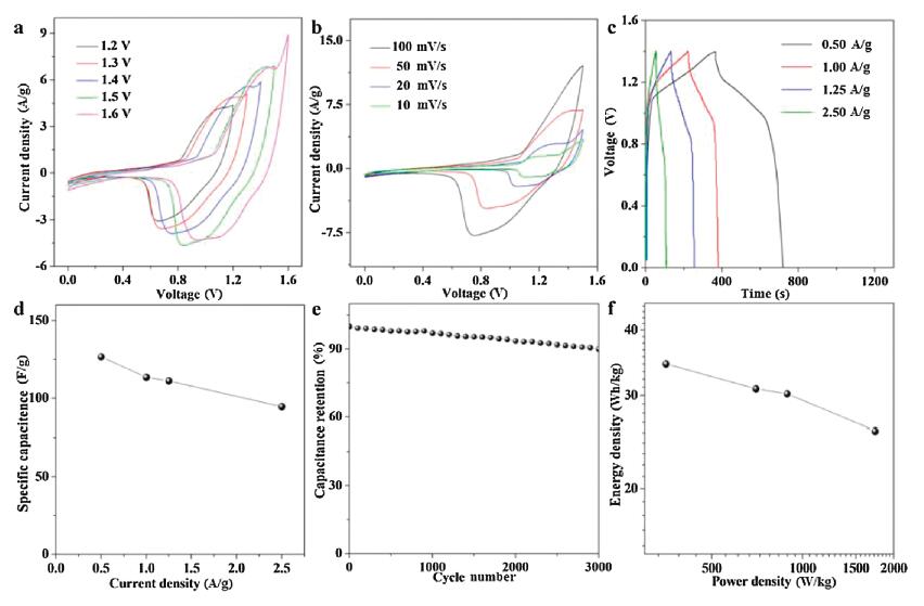 | Fig. 5. Electrochemical characterization of the Fe(PO3)3//AC aqueous device: (a) Cyclic voltammetry curves with different voltage window. (b) Cyclic voltammetry curves with scan rate from 10 mV/s to 100 mV/s. (c) The galvanostatic charging-discharging curves with different current densities (0.50-2.50 A/g). (d) Specific capacitances at the current density of 0.50-2.50 A/g. (e) Charge-discharge cycling test at a current density of 0.5 A/g. (f) Power density-energy density diagram. | |