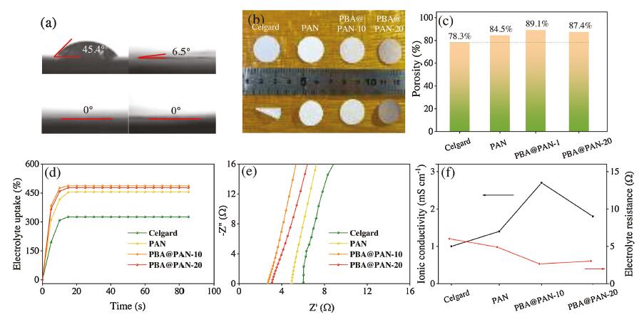 | Fig. 2. (a) Contact angle tests, (b) thermal stability, (c) porosity, (d) electrolyte uptake, (e) AC impedance plot and (f) ionic conductivity of Celgard, PAN and PBA@PAN-x, respectively. | |