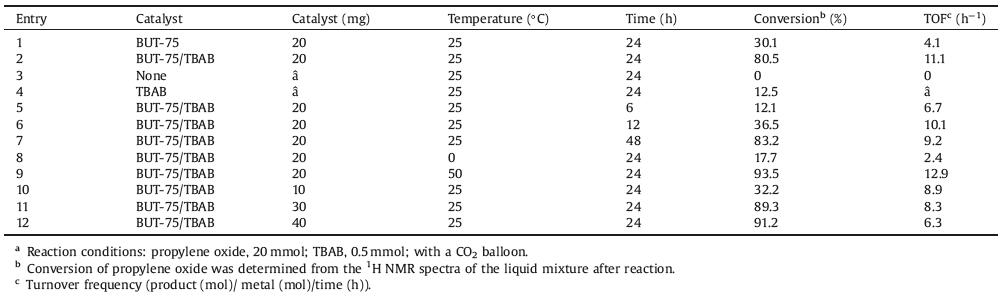 Overall, the above results verify the good performance of the recyclable BUT-75 MOF as an efficient heterogeneous catalyst toward the CO2-epoxide cycloaddition. More importantly, this conversion can proceed under ambient conditions in the presence of the BUT-75 catalyst, which can reduce the energy input and meet the requirement of green chemistry. To the best of our knowledge, only a few MOFs can catalyze this reaction under ambient conditions, among which BUT-75 is superior to others with higher efficiency (Table S3 in Supporting information).