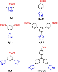The utilization of dual-functional azolate-carboxylate ligands offers a simple yet effective approach to construct stable MOFs superior to either their azolate- or carboxylate-based counterparts. In this regard, there are several dual-functional azolate-carboxylate ligands employed, showing different combinations of functional groups, size, and symmetry (Scheme 1) [19-23]. Among various azolate ligands, pyrazolates with the highest pKa value usually endow the resulting MOFs with enhanced stability by connecting low-valent metal ions. Furthermore, a multifunctional ligand containing more pyrazolate moieties tends to afford more stable MOFs. Therefore, we speculate that a dual-functional pyrazolate-carboxylate ligand bearing more pyrazolate groups would contribute to MOFs with better chemical stability. To date, dual-functional pyrazolate-carboxylate ligand-based MOFs are seldom reported mainly attributed to synthetic difficulties of these ligands and MOF crystals. In addition, the simultaneous coordination of pyrazolate and carboxylate groups with metal centers would afford novel architectures showing high robustness and diverse functionality, which attracts our interest in further exploration.