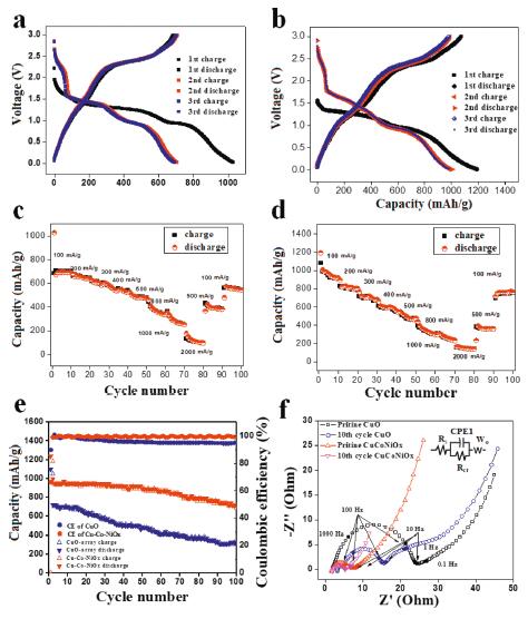 | Fig. 4. Galvanostatic discharge-charge curve of (a) CuO nanowire and (b) CuCoNi-oxide. Rate performances of (c) CuO nanowire, and (d) CuCoNi-oxide nanowire. (e) Comparison of cycling performance comparison at a current density of 100 mA/g. (f) EIS results of CuO nanowire and CuCoNi-oxide nanowire electrodes before and after 10th cycles between CuO array electrode (black and blue hollow symbols) and CuCoNi-oxide array electrode (red and purple hollow symbols) at a current density of 100 mA/g, electric circuit model and some of frequencies (solid symbols). | |