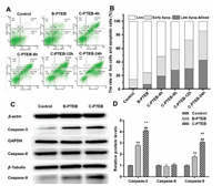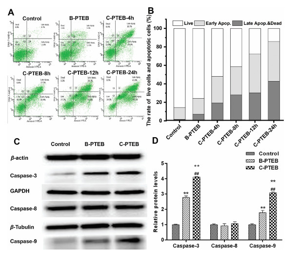 | Fig. 4. C-PTBA induced apoptosis of Y79 cells. (A) The apoptotic rates at different time-points (4, 8, 12 and 24 h) were analyzed with FCM. (B) Statistics of the proportion of living, early apoptosis and late apoptosis rates in different groups. C-PTEB activated caspase 3 and caspase 9 in involved apoptosis in Y79 cells (C and D). At 12 h following treatment, whole-cell lysates were prepared to assay caspase-3, caspase-8, and caspase-9 proteins by western blotting. Data are presented as the mean ± SD from three independent experiments. **P < 0.01, compared with the control group. ##P < 0.01, compared with the B-PTEB group. | |