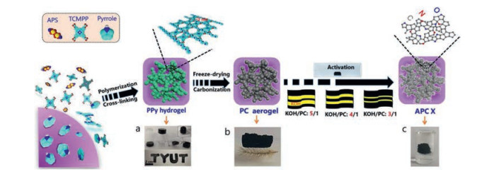 In this work, we developed a template-free precarbonization-activation method to fabricate sub-nanopore-containing N, O-codoped porous carbon based on conjugated PPy hydrogel with molecular-scale grids (diameter ~2.0 nm) as the precursorand KOH as the activator (Fig. 1). This strategy relies on the formation of a supramolecularly crosslinked PPy hydrogelprecursor doped by an oxygen bridge-containing cross-linker 5, 10, 15, 20-tetra(4-(carboxymethyloxy)phenyl)porphyrindine (TCMPP). Density functional theory (DFT) calculations show that the binding energy between TCMPP molecule and PPy chains is much higher than the lattice energy between every pair of closely packed Py units, which renders a more stable porous structure of hydrogel precursor containing a larger amount of pores (about 2 nm). A subsequent carbonization-activation step produces N, O-codoped porous carbons (APCs) with a large amount of sub-nano/marco/meso/micropores on their surface as extra pseudo-capacitance sites. As a result, the optimal APC demonstrates an outstanding capacitive performance including good rate capability, high specific capacitance, and remarkable energy density in solid-state supercapacitor. This work further proves that sub-nanopores are beneficial to increasing the capacitance. It also provides a strategy for preparing sub-nanopore-containing porous carbon by using polymer hydrogel of suitable molecule-scale grids as precursor for a wide range of energy-related applications.