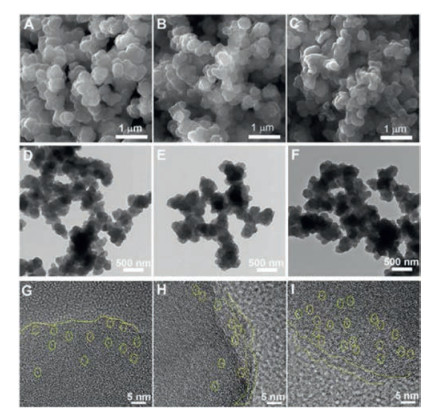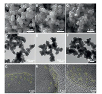 | Fig. 2. SEM, TEM and HRTEM images of (A, D, G) PPy hydrogel, (B, E, H) PC4/1 and (C, F, I) APC4/1. Surrounded by yellow circles in Fig. 2G-I are some nanopores, abundant nano-pores of about 2 nm are homogenously embedded throughout the matrix of PPy hydrogel, PC and APC4/1. | |