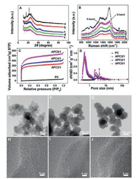 | Fig. 3. (A) XRD and (B) Raman spectra of PPy hydrogel (curve a), PC4/1 (curve b), APC3/1 (curve c), APC4/1 (curve d) and APC5/1 (curve e). (C) Argon (87K) adsorption desorption isotherm and (D) pore size distribution of PC and APCX samples by density functional theory (DFT) mode. TEM images of (E) APC3/1, (F) APC4/1 and (G) APC5/1. HRTEM images of (H) APC3/1, (I) APC4/1 and (J) APC5/1. | |