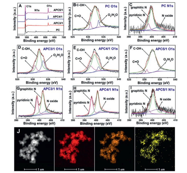 | Fig. 4. XPS survey spectra for (A) PC and APC samples. Fitted high-resolution XPS spectra of (B, D-F) O 1s and (C, G-I) N 1s for PC and APC samples. (J) STEM-EDS elemental mapping images of APC4/1. | |