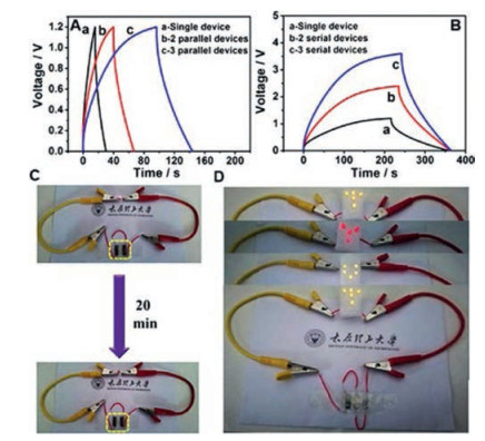 The charge/discharge time of two or three assembled devices connected in series is twice or triples that of a single device; meanwhile the voltage range retains the same (Fig. 6A). Besides, a double or threefold increase in voltage range is obtained when devices are connected in parallel (Fig. 6B). Thus, our SSCs connected in either series or parallel meet the growing demand of smart integrated electronics. Besides, for further practical demonstration, two serially-connected SSCs can continuously power a red LED bulb (2.2 V) for around 20 min (Fig. 6C). Three serially-connected SCs can continuously power four or five LED bulbs (1.8–2.2 V) for around 5 min which constitute the logo of "TYUT" (Fig. 6D).