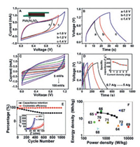 | Fig. 5. (A) CV curves of APC4/1//APC4/1 all solid-state supercapacitor (SSC) recorded within different working potential windows. Scan rate: 50 mV/s. (B) GCD cycles for SSC in the voltage windows of 0-1.0 V, 0-1.2 V and 0-1.4 V at current density of 4 A/g. (C) CV curves of the solid-state device at scan rates of 5-100 mV/s. (D) GCD curves of the SSC recorded at different current densities. (E) Cycle life of the SSC at 5 mA/cm2. (F) Ragone plots comparing the APC-SSC to recently reported PC-based SSC devices. Inset: Nyquist plots of APC4/1//APC4/1 before and after stability test. | |