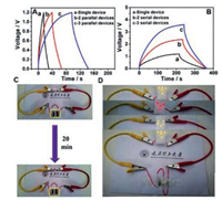 | Fig. 6. (A) GCD curves of three serially-connected SSCs at 5 A/g. (B) GCD curves of three parallelly-connected SSCs at 1 A/g. (C) Digital images of a red LED bulb powered by two SSCs connected in series. (D) Digital images of three connected SSCs for powering the logo of "TYUT". | |