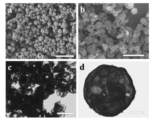 | Fig. 1. SEM images of (a) SP(St-DVB) template and (b) C/S/N-TiO2 microspheres. (c) TEM images of C/S/N-TiO2 microspheres and (d) an enlarged microsphere. The bar is (a) 20 & amp; thinsp; μm, (b) 10 μm, (c) 5 μm and (d) 1 μm, respectively. | |