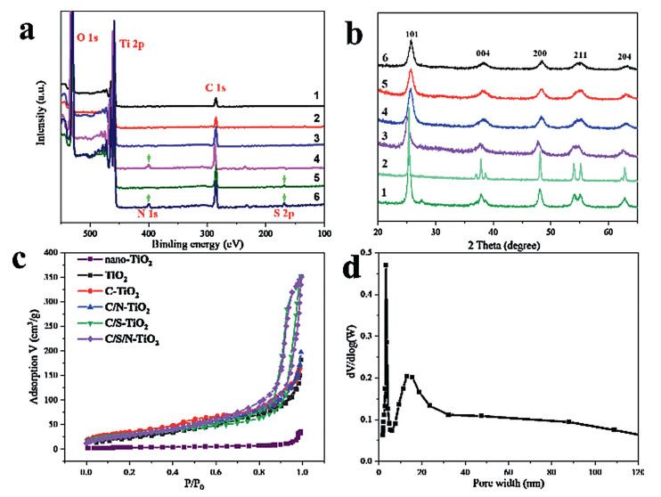 | Fig. 2. (a) XPS survey scans and (b) XRD patterns of (1) nano-TiO2, (2) porous TiO2, (3) C-TiO2, (4) C/N-TiO2, (5) C/S-TiO2 and (6) C/S/N-TiO2. (c) Nitrogen adsorption/desorption isotherms of nano-TiO2, porous TiO2 microspheres and various doped-TiO2 porous microspheres. (d) BJH pore size distribution curves of porous C/S/N-TiO2 microspheres. | |
