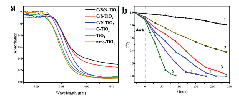 | Fig. 3. (a) UV–vis diffuse reflectance spectra and (b) degradation curves of RhB photocatalyzed by: (1) nano-TiO2, (2) TiO2, (3) C-TiO2, (4) C/S-TiO2, (5) C/N-TiO2 and (6) C/S/N-TiO2. | |
