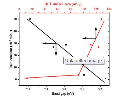 | Fig. 4. Degradation rate constants versus BET surface areas or band gaps of different TiO2 partiles. | |