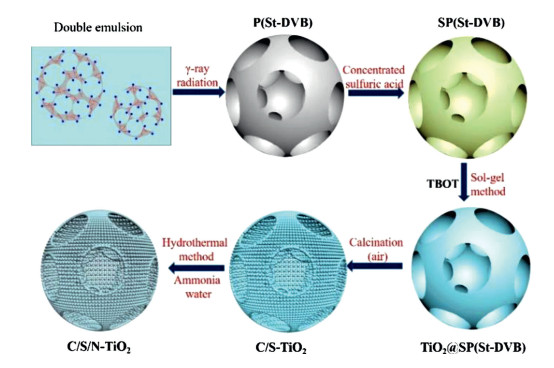 | Scheme1. Schematic illustration of the synthetic procedure of macroporous-mesoporous C-, S-, N-doped TiO2 microspheres. | |