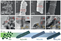 | Fig. 1. SEM and HR-TEM images of (a, e) NiO, (b, f) Ni2Co-DO, (c, g) NiCo-DO, and (d, h) NiCo2-DO, respectively. (i) Schematic illustration of morphology variety of the above four samples. | |