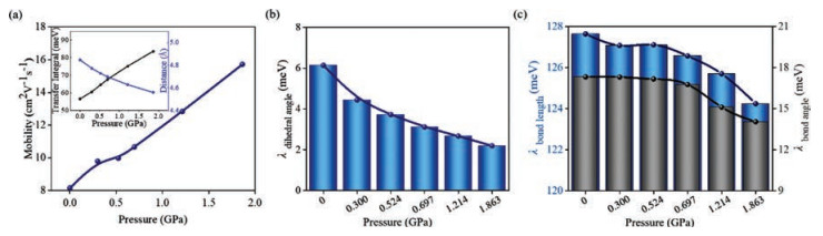 | Fig. 3. (a) The maximum mobility at different pressures and the inset picture shows hole transfer integral and adjacent molecular distance of P1 direction at different pressures. Projection of the total reorganization energy λ onto the (b) dihedral angle, (c) bond angle and bond length of DPA crystals at different pressures. | |