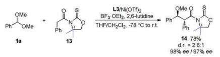 Based on above analysis, we envisioned that placing a germinal substitution at the C4 of 1, 3-oxazolidine-2-thione might be beneficial for improving the d.r.. Under the standard conditions, asymmetric alkylation of acetal 1a with 13 bearing a germinal dimethyl substitution proceeded, furnishing expected 14 in 78% yield and 98% ee/97% ee as a separable mixture of diastereomers (d.r.=2.6:1), indicating that modification of 1, 3-oxazolidine-2-thione might be a viable approach for enhancing the diastereoselectivity (Scheme 5).