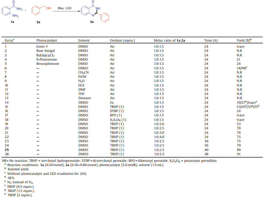 To optimize the reaction conditions, we initially chose 2-aminobenzamide (1a) to react with benzyl alcohol (2a) as a model system. To achieve a green reaction outcome, we examined photocatalysts such as eosin Y, rose bengal, Ru(bpy)3Cl2, 9-fluorenone, and benzophenone. The reaction was carried out in DMSO under light from an 18-W blue LED in air for 24h when 9-fluorenone or benzophenone (5.0mol%) was used as the photoredox catalyst; pleasingly the reaction proceeded to afford the desired product 3a in 21% or 24% yield, respectively (Table 1, entries 4 and 5). To our delight, 3a was obtained in 14% yield when the model reaction was conducted in DMSO in the absence of a photocatalyst (entry 6). A further control experiment without the photocatalyst and without irradiation with LED light only recovered the two starting materials (entry 6). Subsequently, a number of solvents, oxidants, times, and molar ratios of substrates were examined with the aim of improving reaction efficiency. It is noteworthy that, among the solvents screened (entries 6–13), the target product was obtained only in DMSO as the solvent (entry 6). Furthermore, when various oxidants were screened (entries 14–18), a slightly improved yield of 3a was achieved when an oxygen balloon was used instead air (entry 14 vs. 6). At the same time, with O2 as the greenest oxidant, we attempted to increase the yield by extending the reaction time, but only obtained 3a in 27% yield (entry 14); however, 3a was only obtained in trace amounts when the reaction was performed in a nitrogen atmosphere (entry 14). It should be noted that tert-butylhydroperoxide (TBHP) was the most effective oxidant for the reaction, affording product 3a in 53% yield (entry 15); therefore, TBHP was selected as the oxidant in subsequent experiments. The amount of oxidant was next investigated, which revealed that that the initial choice of TBHP (1 equiv.) was fortuitous. The 1a: 2a ratio, as well as the reaction time were also optimized, the results of which are summarized in Table 1 (entries 15, 19–26).