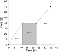 To confirm whether or not the reaction involves a chain process, a "light on/off experiment" was performed. Fig. 2 reveals the product was not generated during the dark period, confirming that light is required throughout the entire reaction period.
