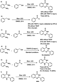 Several control experiments were conducted with the aim of clarifying the reaction mechanism (Scheme 3). To understand the role of TBHP, we first reacted 1a with 2a in air, which provided 3a in 34% isolated yield, while nitrogen instead of TBHP provided 3a in very low yield (Scheme 3a). We then observed that benzyl alcohol can be converted into benzaldehyde under the standard conditions (Scheme 3b), and that replacing benzyl alcohol with benzaldehyde also led to the successful formation of 3a under the above conditions in a little less time. Moreover, we found that 2, 2, 6, 6-tetramethylpiperidine-N-oxide (TEMPO), a commonly used radical scavenger, completely inhibited the model reaction under the standard conditions, indicating that the reaction may involve a radical pathway (Scheme 3d). Further, the expected intermediate could be successfully prepared from benzaldehyde and 2-aminobenzamide in the presence of visible light and O2 (Scheme 3e); then intermediate could be transformed into product 3a in high yield under visible-light promoted aerobic oxidative conditions (Scheme 3f).