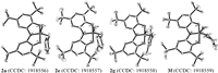 | Fig. 3. Molecular structures of 2a, 2e, 2g and 3f (thermal ellipsoids shown at 50% probability). Hydrogen atoms and solvents were omitted for clarity. | |