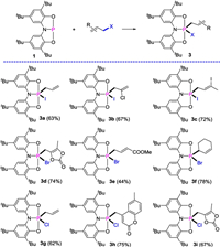 Under similar conditions, allyl bromide and allyl chloride were also found to undergo formal C–X bond oxidative addition with 1. As shown in Fig. 7, the substituted allyl bromide, such as 4-bromomethyl-5-methyl-1, 3-dioxol-2-one, methyl 4-bromocrotonate, and 3-bromocyclohexene, could react with compound 1 to form penta-coordinate phosphoranes 3d-3f in high yields. The 31P NMR resonances in each species were observed in the narrow range of −26.5 to −13.6 ppm, consistent with an analogous structure of penta-coordinate adducts 2d-2f (−25.8 ~ −21.7 ppm). In addition, the C-Cl bonds in allyl chloride with different substitutes or heterocycles (3g-3i) were also reacted by the phosphorus center in compound 1. The proton-coupled 31P NMR resonance (−12.1 ~ −7.6 ppm) was also observed for these adducts of allyl chloride with compound 1.