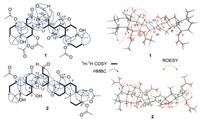 | Fig. 2. 1H-1H COSY, key HMBC, and ROESY correlations of compounds 1 and 2. | |