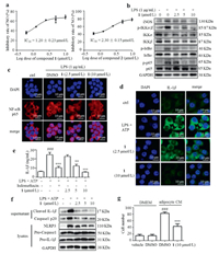| Fig. 4. Compound 1 inhibited IL-1 β production in THP-1 macrophages. (a) NO inhibitory rates for compounds 1 and 2. (b) The protein levels of iNOS, p-IKK α/β, IKK α, IKK β, p-I κB α, I κB α, p-p65 and p65 were detected by Western blot analysis. GAPDH (glyceraldehyde 3-phosphate dehydrogenase) was used as an internal loading control. (c) The nuclear translocation of p65 was detected by immunostaining. Nuclei were stained with DAPI (4', 6-diamidino-2-phenylindole). Scale bar = 10 μm. (d) Immunofluorescence staining of IL-1 β was performed. Scale bar=10 μm. (e) The protein level of IL-1 β in the culture medium from THP-1 cells was determined by ELISA. Data are expressed as means±SEM (n=6).###P < 0.001 LPS+ATP vs. control, **P < 0.01 and ***P < 0.001, 1 vs. LPS+ATP. (f) Cleaved IL-1 β, NLRP3 and Caspase 1 in the supernatant or lysates of THP-1 cells were detected by western blotting. GAPDH was used as an internal loading control. (g) Migrated THP-1 cells towards adipocyte CM were quantified. Data are expressed as means±SEM (n=6).###P < 0.001, DMEM (Dulbecco's modified Eagle's medium) + DMSO (dimethyl sulfoxide) vs. adipocyte CM+DMSO; ***P < 0.001, adipocyte CM + 1 vs. adipocyte CM+DMSO. | |