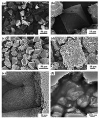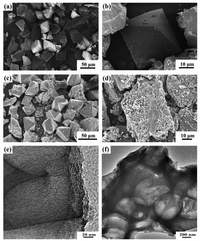 | Fig. 2. SEM images of (a, b) NPMOF crystals and (c, d) NPMOF-800. (e, f) TEM images of NPMOF-800. | |