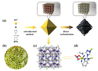 | Fig. 1. Schematic illustration for the preparation of (a) MOF-derived porous carbonsand single crystal structure of NPMOF. (b) Photos of the NPMOF crystals. (c) Structure with encapsulated acetonitrile molecules showing in space-filling model. (d) The coordination state of Zn metal (gray: C atom, red: O atom, blue: N atom, yellow: Zn atom, white: H atom). | |